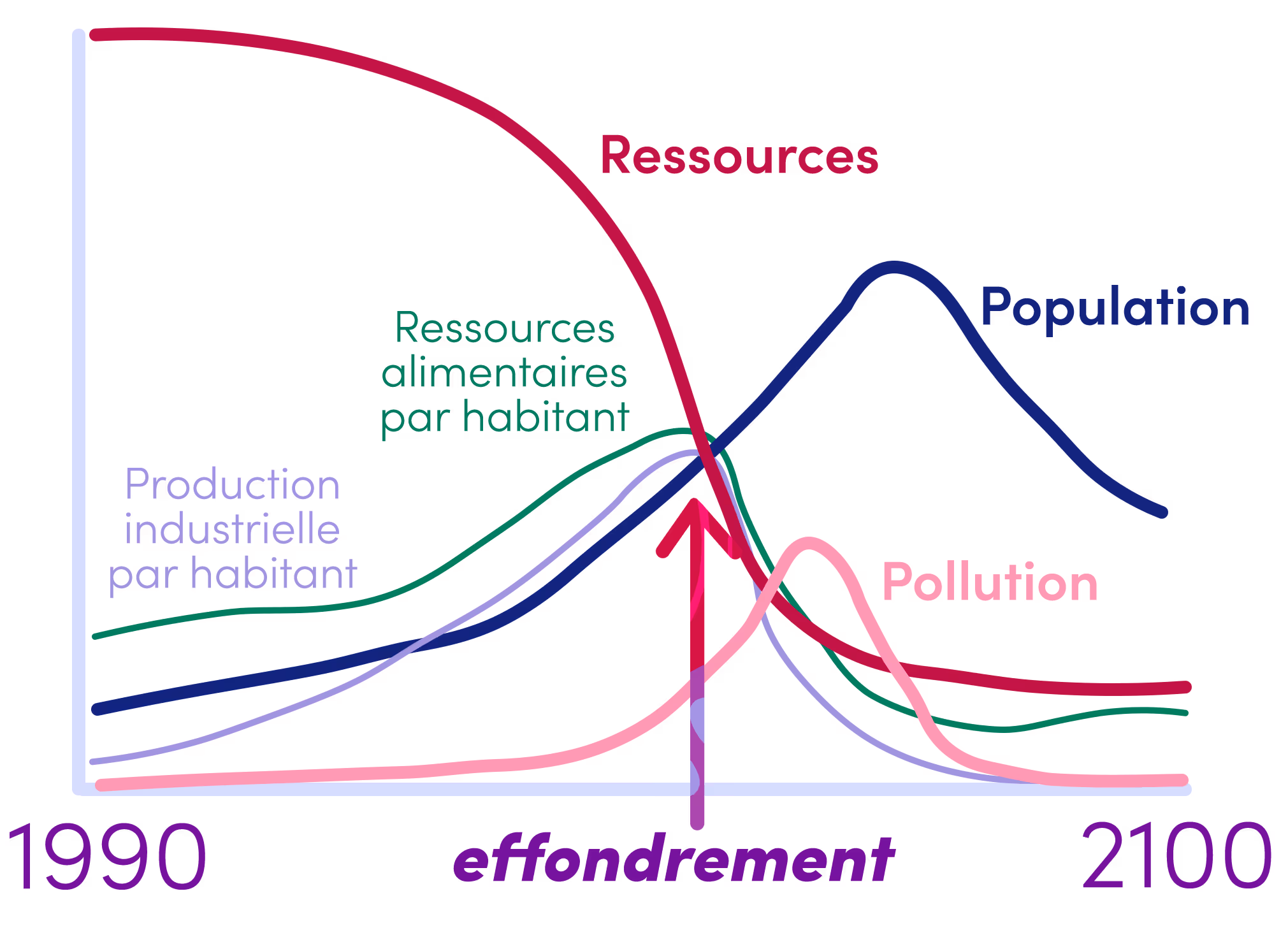 Un algorithme permet ensuite de simuler l’évolution du système jusqu’en 2100. Un premier scénario basé sur les données et tendances de l’époque prévoit… un effondrement ! C’est-à-dire une chute drastique de la population et de la production industrielle. La cause ? Une surexploitation des ressources. Aïe !