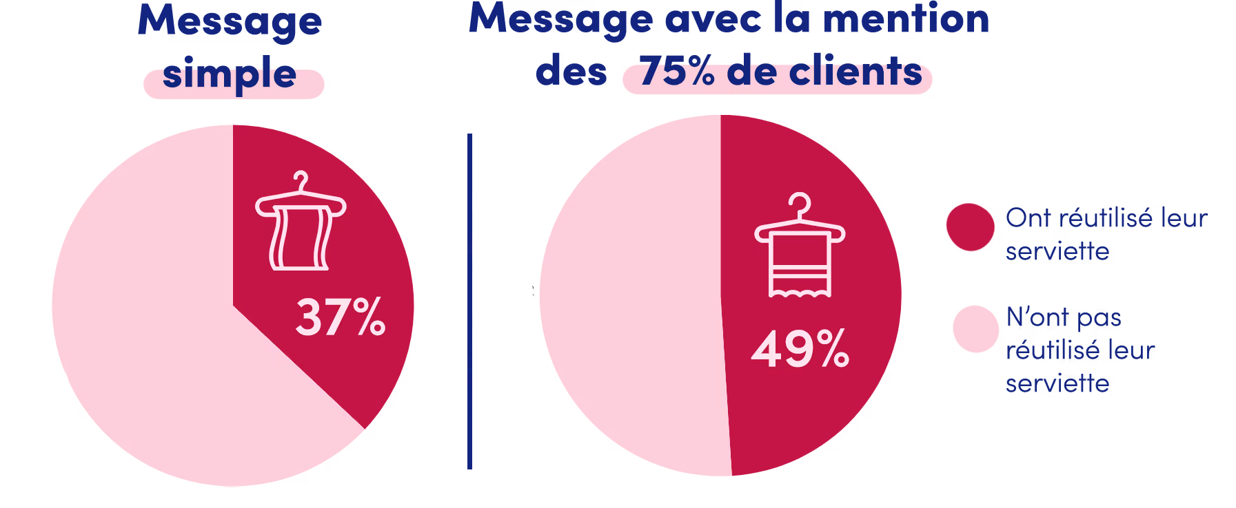 Après une période de 53 jours durant laquelle les employés de l’hôtel comptabilisent qui a conservé ou non sa serviette parmi les clients restés au moins deux jours, les chercheurs sortent leurs calculatrices. 37 % des personnes soumises au message le plus simple ont réutilisé leur serviette.