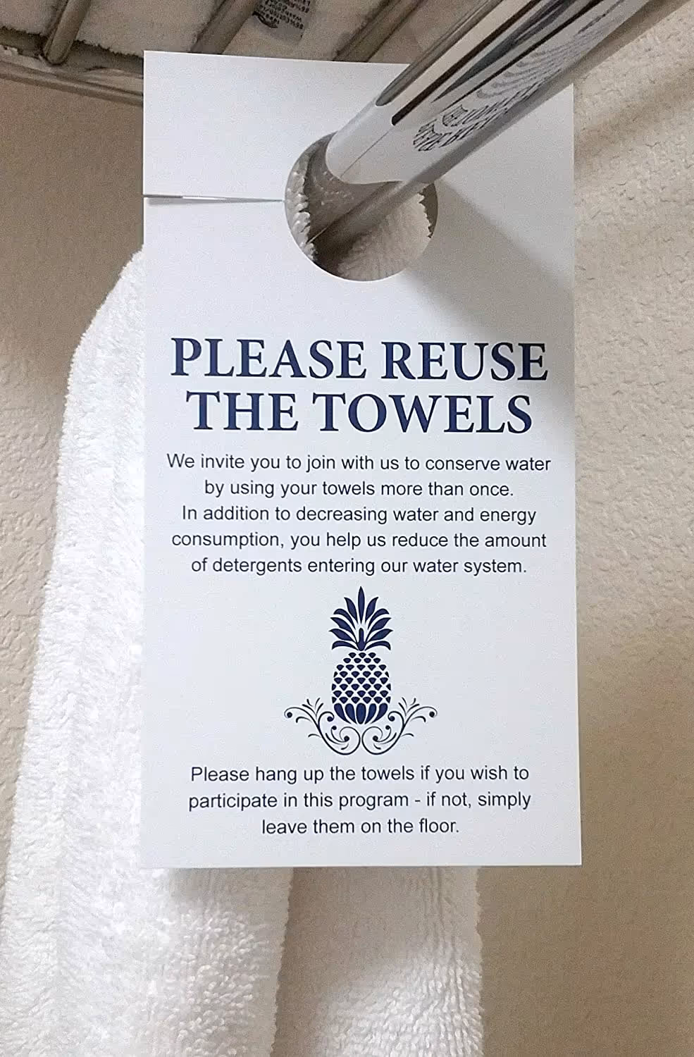 Une partie des clients découvre ainsi le message suivant : "Aidez-nous à préserver l’environnement. Vous pouvez manifester votre respect de la nature… en réutilisant votre serviette durant tout votre séjour." Pour signaler qu’ils conservent leur serviette, il leur est ensuite demandé de l’accrocher à un emplacement dédié.