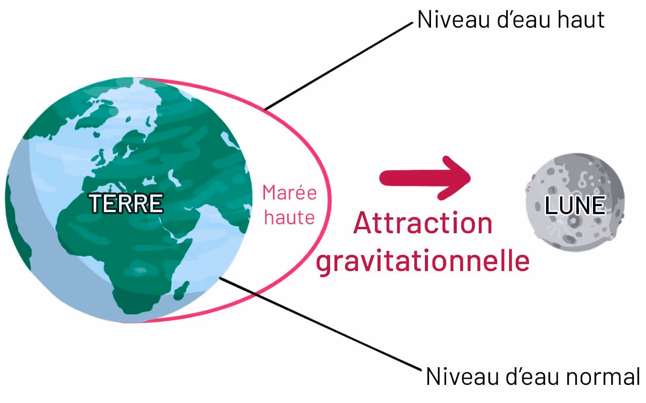 Avant tout, savez-vous d’où viennent les marées ? La réponse est… du ciel ! Le mouvement des océans est un vaste ballet orchestré par la Terre, le Soleil et la Lune, et c’est notre satellite qui mène la danse : en attirant la mer grâce à la force de gravitation, elle crée une marée haute sur les côtes qui lui font face.