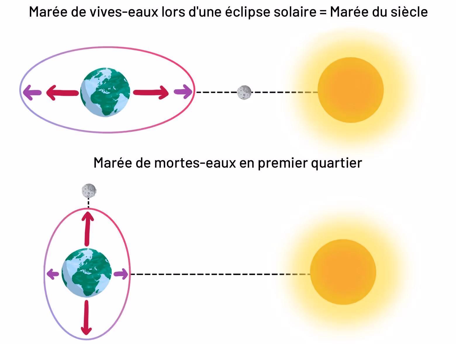 D'accord, mais des équinoxes, il y en a tous les ans. Alors pourquoi des "marées du siècle" ? Pour obtenir de telles amplitudes, il faut - littéralement - aligner les trois astres. Lors d'une éclipse de Soleil, ils sont bien en rang et la Lune et le Soleil "tirent" dans la même direction, ce qui amplifie les marées.