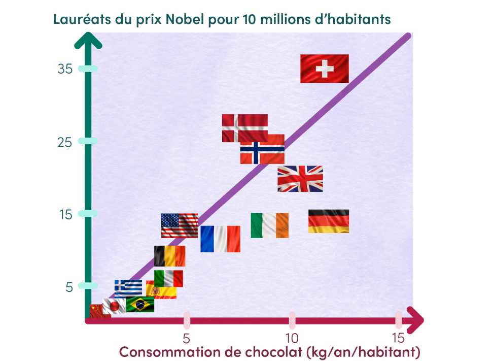 Il y a bien une corrélation entre chocolat et prix Nobel, mais l’un n’est pas la cause de l’autre. Un troisième facteur intervient : le revenu par habitant, qui est la causalité des deux autres indicateurs.