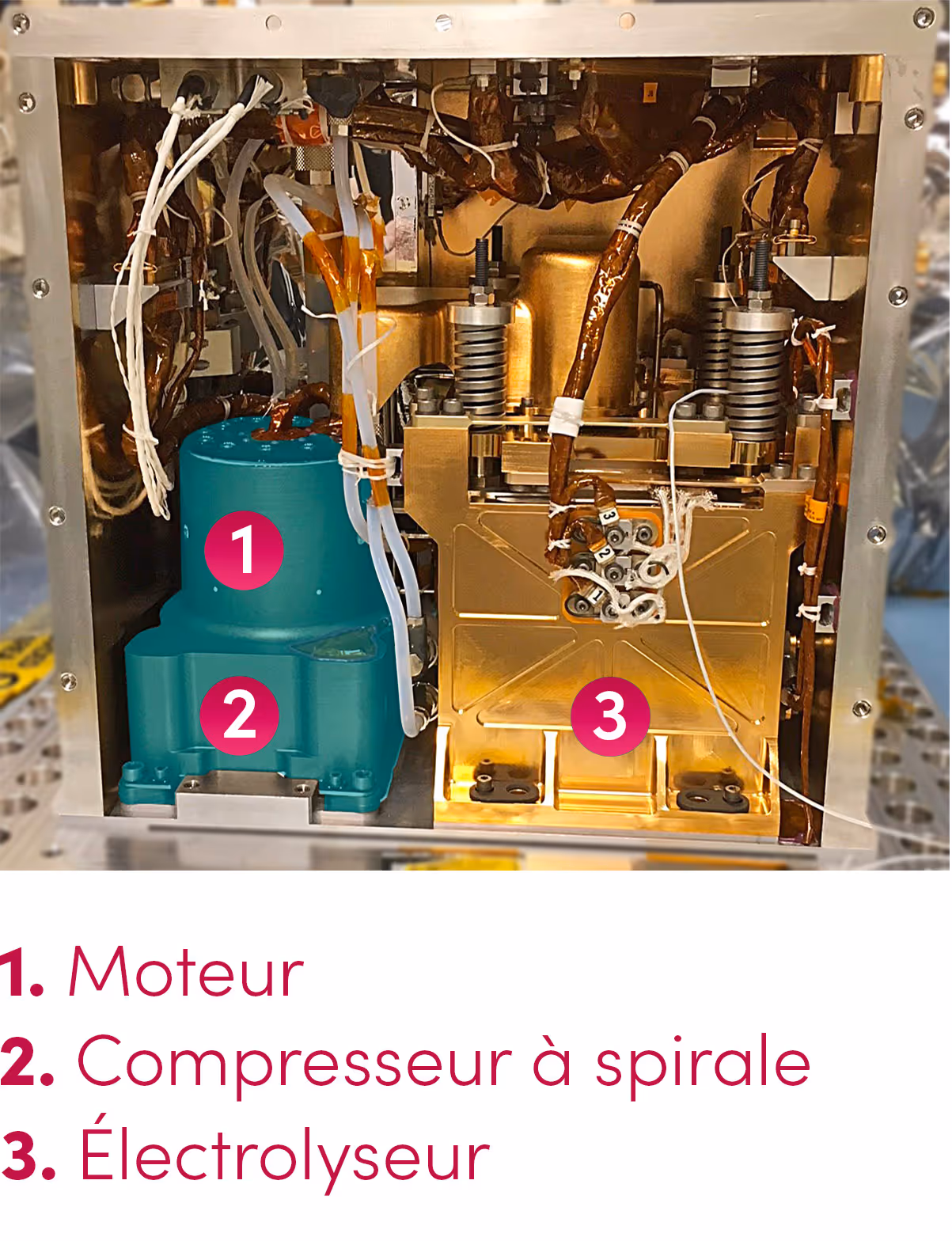 Le fonctionnement de MOXIE repose sur l’électrolyse, un processus qui consiste à séparer des éléments chimiques grâce à un courant électrique. Concrètement, MOXIE aspire, filtre et comprime l’air martien qui passe ensuite au travers d’un électrolyseur. Un atome d’oxygène (O) est alors extrait de la molécule de CO2. Les atomes d'oxygène sont ensuite recombinés afin de produire de l’O2 pur, tandis que le monoxyde de carbone résiduel (CO) est rejeté.