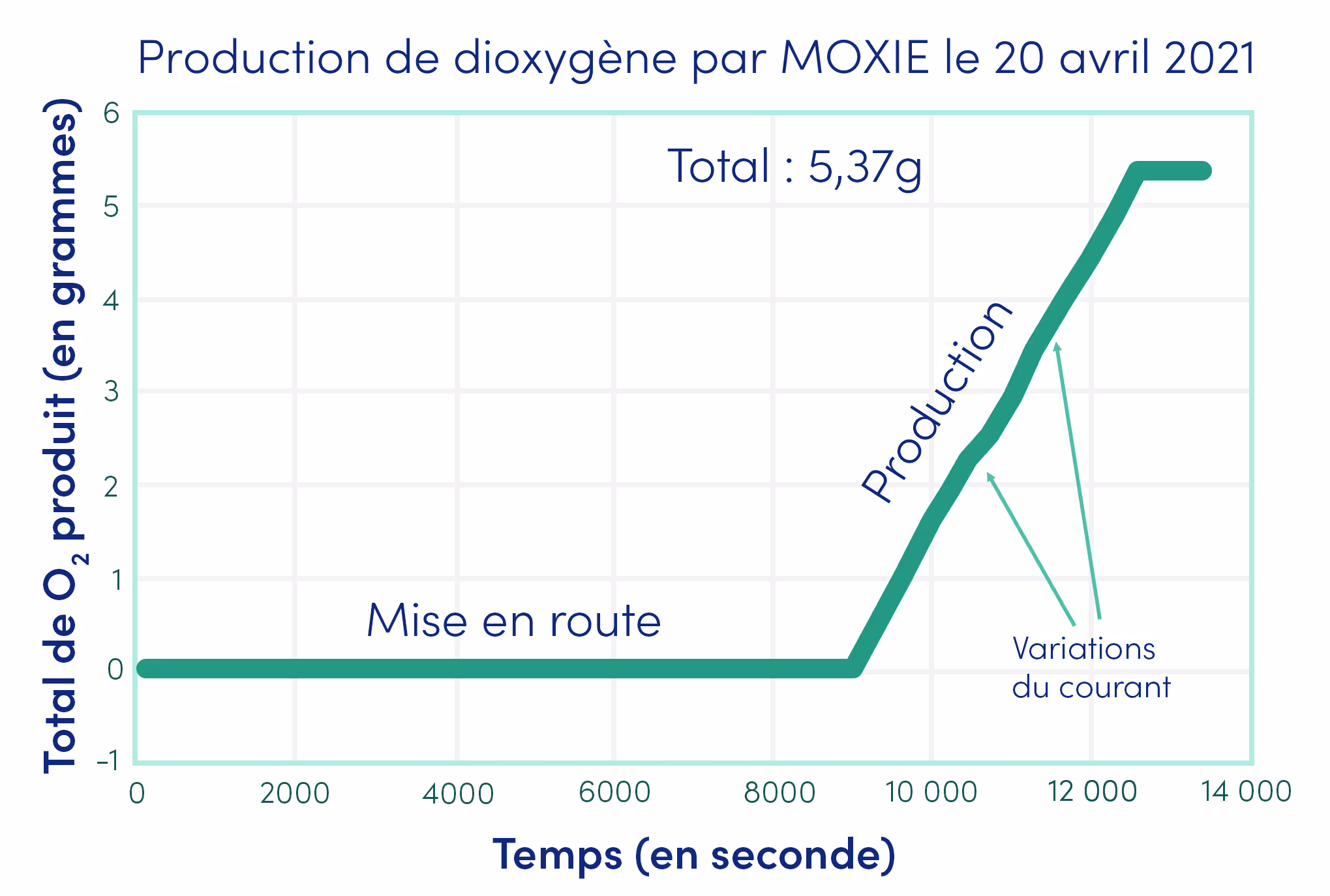 S’il n’y a pas encore de quoi faire respirer un astronaute pendant plusieurs jours, MOXIE a du potentiel. Toutes séquences de test cumulées, l’expérience a produit 122 grammes de dioxygène, soit la quantité d’air nécessaire à un petit chien pendant 10 heures ! À l’avenir, l’objectif serait d’en générer suffisamment pour une mission spatiale habitée.