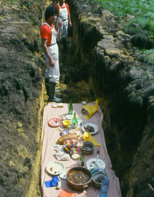En effet, en plein milieu du repas dans le parc, les convives abandonnent leurs assiettes. La table du banquet, la nappe, les couverts et les plats entamés, sont déposés dans une tranchée de plusieurs dizaines de mètres de long. Puis tout est enseveli sous la terre à la pelleteuse… La performance est baptisée Le Déjeuner sous l’herbe, un hommage absurde au célèbre tableau d'Édouard Manet Le Déjeuner sur l’herbe.