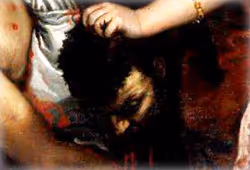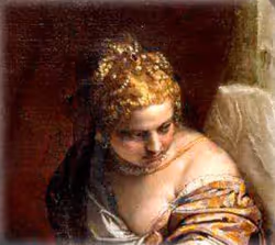 Véronèse représente ici l’instant qui suit la décapitation : Judith s’apprête à mettre la tête sanguinolente dans le sac que lui tend sa servante. On lit sur le visage de l’héroïne sa détermination mêlée de dégoût. Dans le contexte politique de l’époque, l’allusion est claire. Mais pour rendre cette signification encore plus évidente, Véronèse a glissé quelques indices…